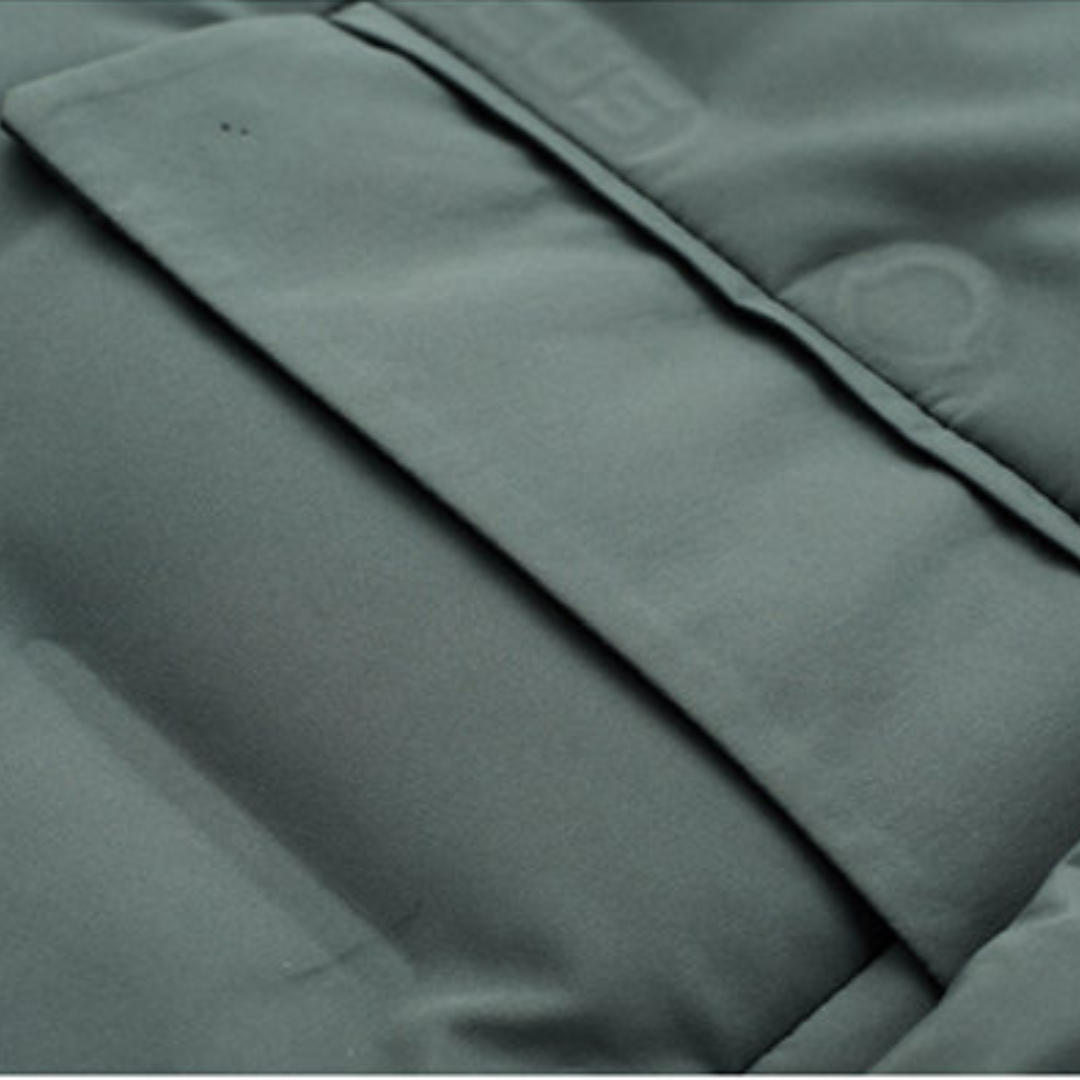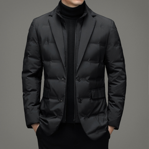 This down puffer jacket is cut like a tailored blazer, giving you office ready polish with serious cold weather performance. The smooth woven shell has a light sheen that pairs cleanly with the sharp notch lapels and flap pockets. A full inner zip placket and insulated stand collar sit under the two button front, trapping warmth while staying streamlined. Lightweight duck down fill keeps the profile trim, so it layers easily over shirts or knits without bulk. Hidden knit cuffs and a triple layer build help seal out wind on city commutes and winter evenings.