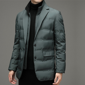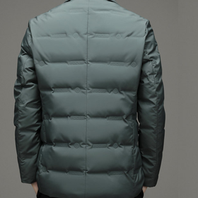 This down puffer jacket is cut like a tailored blazer, giving you office ready polish with serious cold weather performance. The smooth woven shell has a light sheen that pairs cleanly with the sharp notch lapels and flap pockets. A full inner zip placket and insulated stand collar sit under the two button front, trapping warmth while staying streamlined. Lightweight duck down fill keeps the profile trim, so it layers easily over shirts or knits without bulk. Hidden knit cuffs and a triple layer build help seal out wind on city commutes and winter evenings.